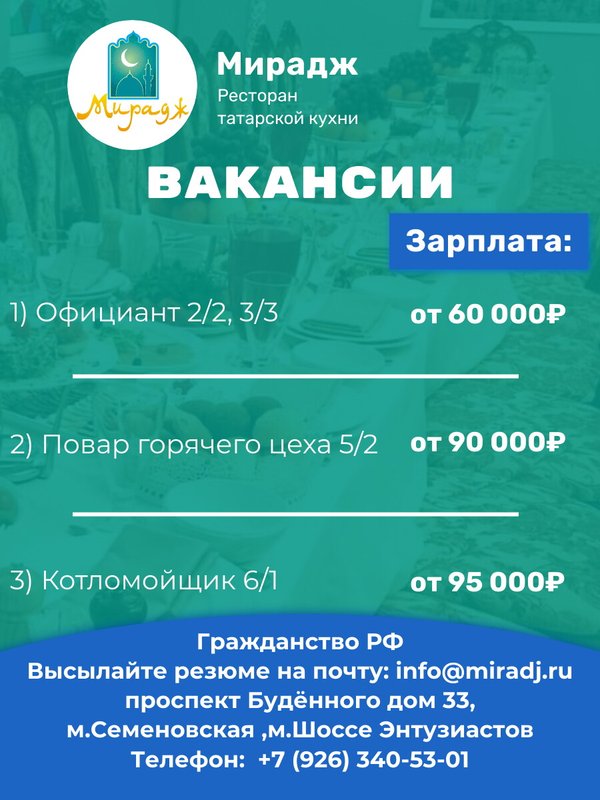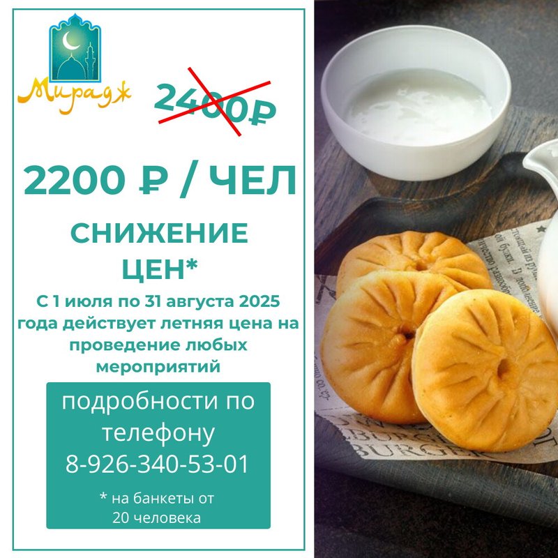 Преимущества: Хочу сказать спасибо ресторану Мирадж за обслуживание и превосходные блюда! Мы отмечали тут свадьбу и все так классно прошло!! Сначала переживала, что будет мало место для веселья, но на деле все прошло отлично. Шикарно накрытые столы, вкуснейшие татарские блюда халяль, красивые фотозоны. Гости тоже оценили обстановку, спасибо